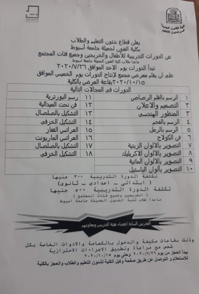 يعلن قطاع شئون التعليم و الطلاب بكلية الفنون الجميلة - جامعة اسيوط عن بدء النشاط الصيفى السنوى - الدورات التدريبية - لتنمية الابداع الفنى وزيادة الوعى الثقافى الفنى واكتشاف وتبنى المواهب لجميع فئات المجتمع على ان يكون المدربين السادة اعضاء هيئة التدريس ومعاونيهم وان تكون القاعات مكيفة مع ان يكون الحضور بالكمامة