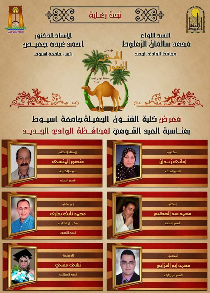 The Faculty of Fine Arts - Assiut University participated in a technical exhibition for faculty members and their assistants in the college during the celebrations of the new valley in the National Day. The exhibition includes paintings and works of art for sculpture in the field and barges, photography and graphic artistsProf. Mansour Al-Mansi - SculptureProf. Amany Zidan - SculptureProf. Mohamed Thabet Badary - PhotographyDr. Mohamed Abdel Hakim - SculptureDr. Nihi Al-Mufti - GraphicGraphic Design