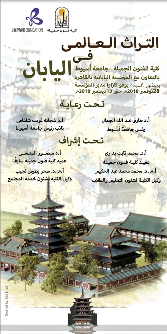 We have the honor to invite you to attend the exhibition (World Heritage in Japan) College of Fine Arts Assiut University on Wednesday, 28/11/2018 at 11 o'clock in the exhibition hall in the hall and continue until 13/12/2018In cooperation with the Japanese Foundation in Cairo in the presence of the Director of the Foundation, Mr. Yufu Kazawra, under the patronage of His Excellency Dr. Tarek Abdullah Jamal, President of Assiut University and his Excellency Prof. Dr. Shehata Ghareeb, Vice President of Assiut UniversityUnder the supervision of Prof. Dr. Mohamed Thabet Badary, Dean of the Faculty of Fine Arts Assiut University and his mentor Prof. Dr. Mansour El Mansa Dean of the Faculty of Fine Arts, Former Assiut University, His Excellency Dr. Mohamed Mohamed Abdel Hakim, Vice Dean for Education and Students Affairs, The environment