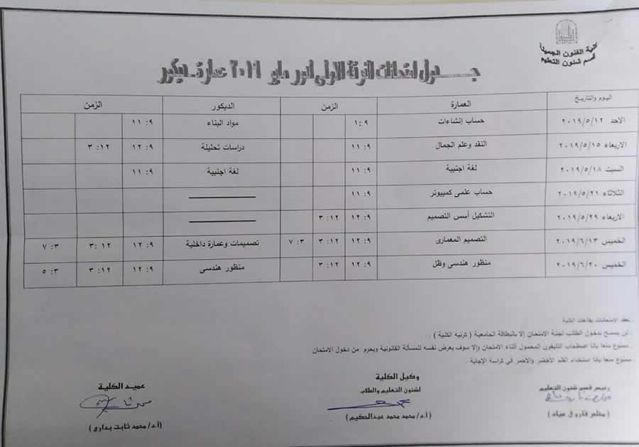 Schedules of the role of May exams for the first group decoration and architecture for the academic year 2019/2018