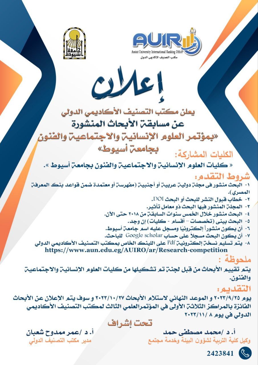 Announcement of the latest research at the Humanities, Social Sciences and Arts Conference in Assiut 25 September 2023 Link to apply on the university website : https://www.aun.edu.eg/AUIRO/ar/Research-competition www.aun.edu.eg Application form for the internationally published research competition in the field of humanities and social sciences