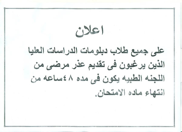 All students of postgraduate diplomas who wish to submit a satisfactory excuse from the medical committee shall be within 48 hours of the completion of the exam material