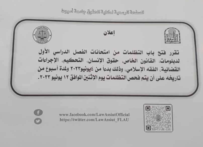It was decided to open the door for grievances from the first semester exams for diplomas in private law, human rights, arbitration, judicial procedures and Islamic jurisprudence, starting from June 4, 2023 and for a week from its date, provided that the grievances are examined on Monday, corresponding to June 12, 2023.