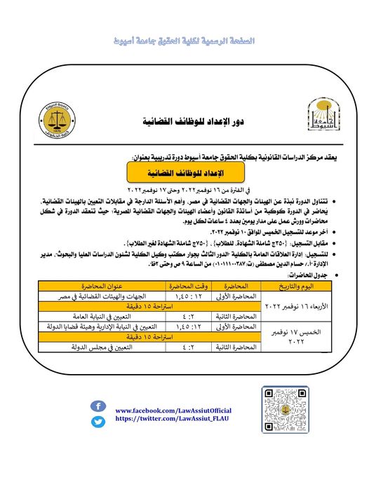 إعلان هام" دورة الإعداد للوظائف القضائية " 27 أكتوبر 2022 تحت إشراف: أ.د./ شحاته غريب شلقامي. عميد الكلية أ.د./ معمر رتيب عبدالحافظ وكيل الكلية لشئون البيئة وخدمة المجتمع أ.د./ عثمان عبدالقادر مدير مركز الدراسات القانونية بالكلية