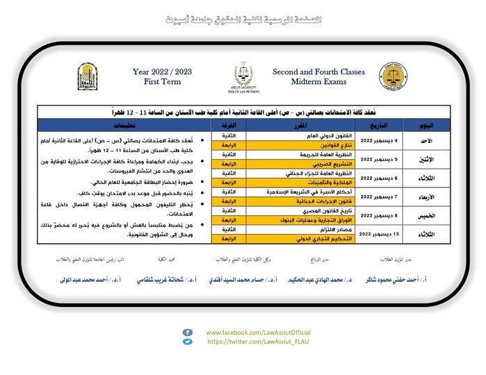 جدول امتحانات أعمال السنة الترم الأول الفرقة الثانية والرابعة 2022 / 2023