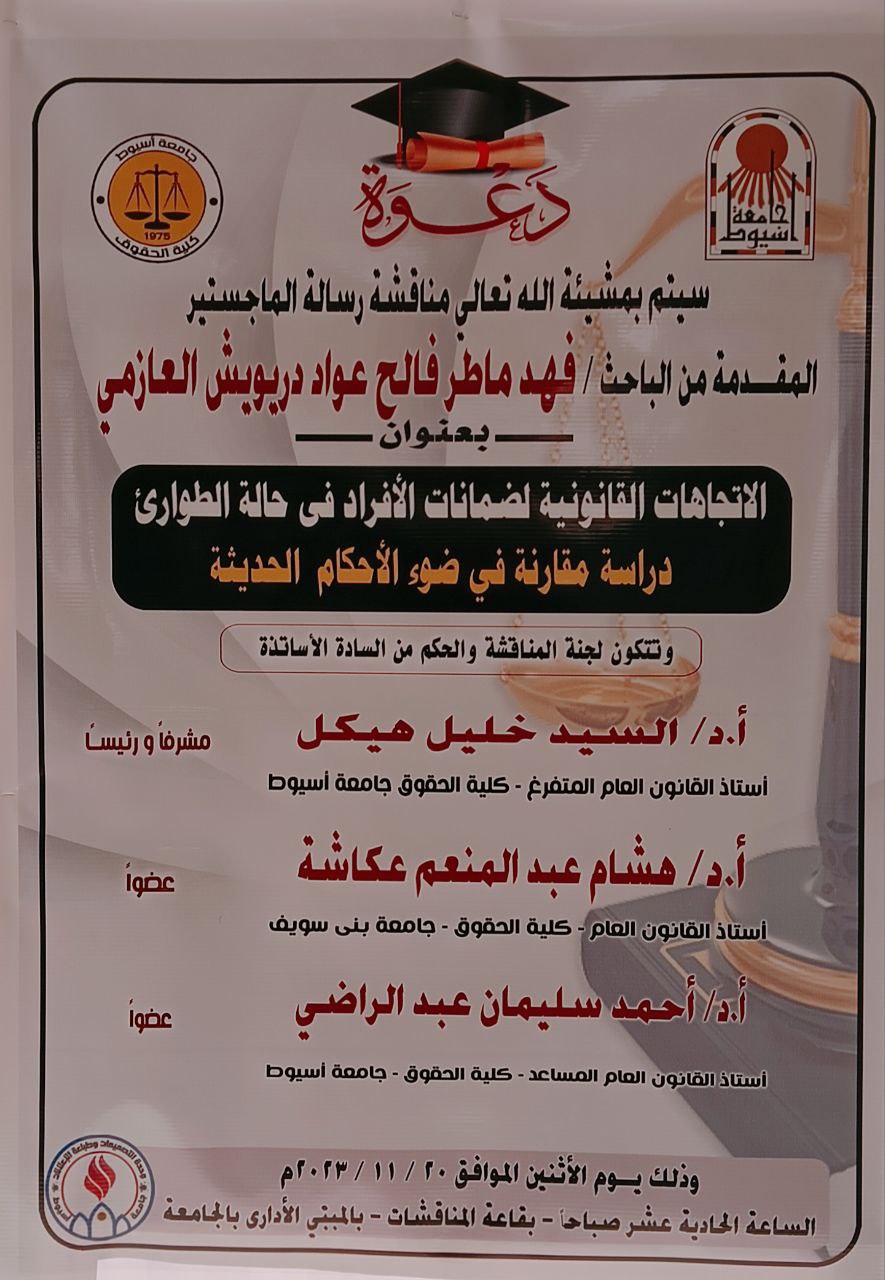 مناقشة رسالة الباحث / فهد ماطر فالح عواد دريويش العازمي تحت عنوان " الاتجاهات القانونية لضمانات الأفراد في حالة الطوارئ " دراسة مقارنة في ضوء الأحكام الحديثة