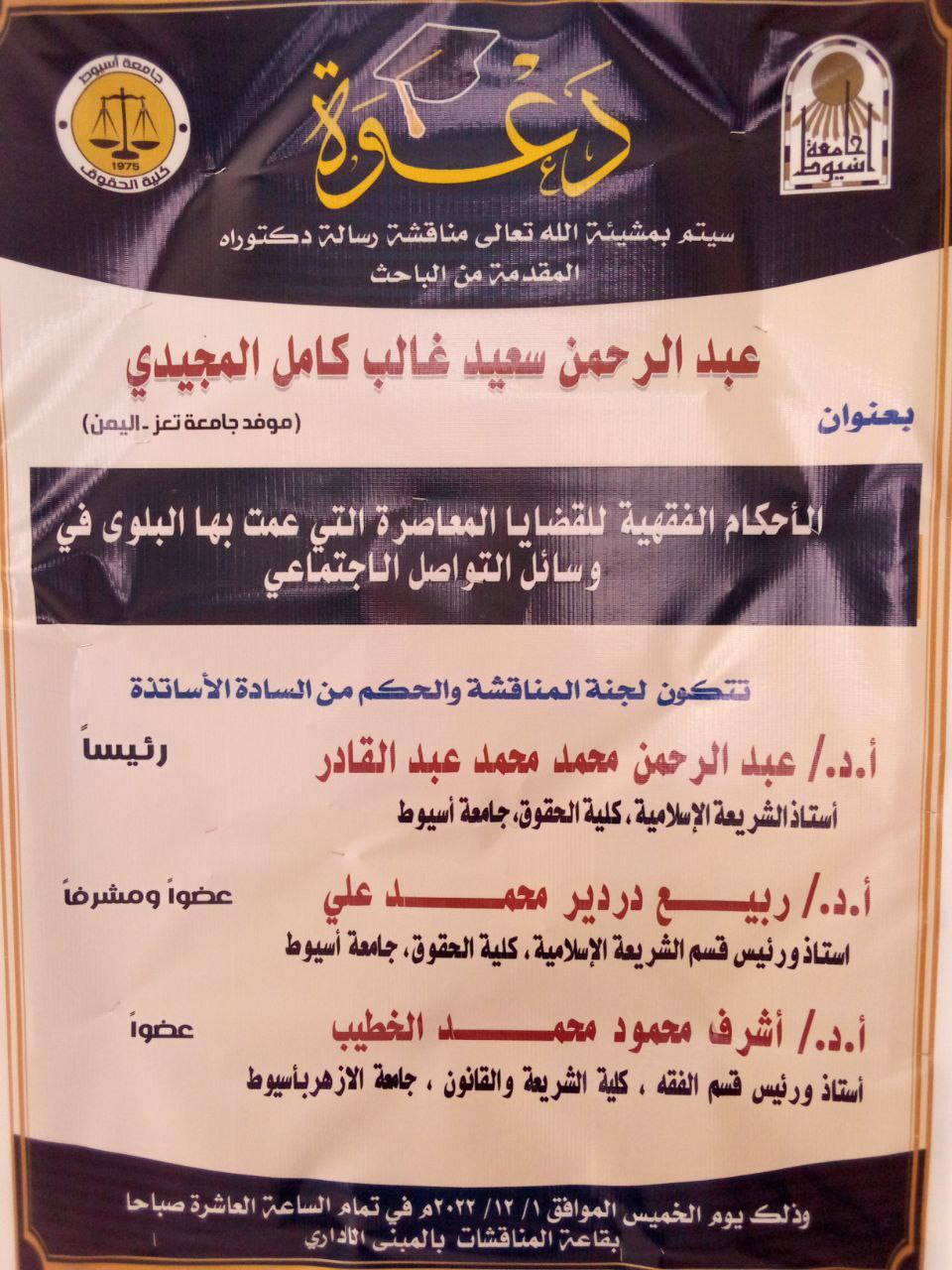 مناقشة رسالة الدكتوراة للباحث / عبدالرحمن سعيد غالب المجيدي " يمني الجنسية " - بعنوان " الأحكام الفقهية للقضايا المعاصرة التي عمت بها البلوى في وسائل التواصل الإجتماعي "