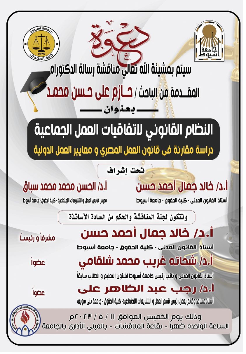 مناقشة رسالة الدكتوراة للباحث / حازم علي حسن محمد بعنوان " النظام القانوني لإتفاقيات العمل الجماعية - دراسة مقارنة في قانون العمل المصري ومعايير العمل الدولية "