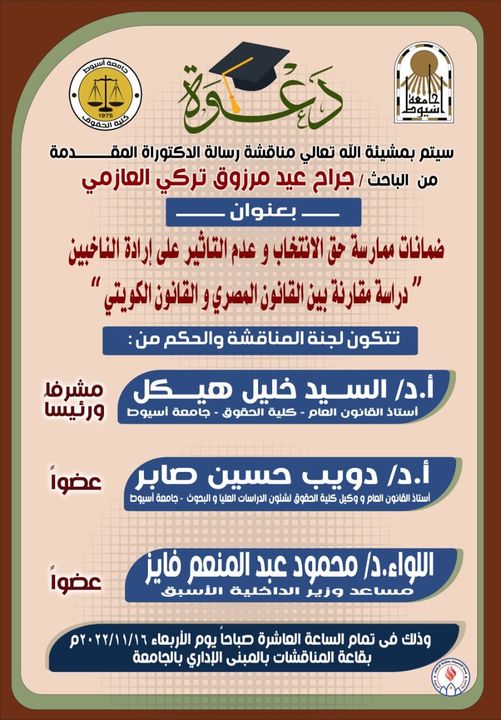 مناقشة رسالة الدكتوراة للباحث / جراح عيد مرزوق تركي العازمي بعنوان " ضمانات ممارسة حق الإنتخاب وعدم التأثير على إرادة الناخبين " - دراسة مقارنة بين القانون المصري والقانون الكويتي