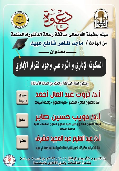 مناقشة رسالة الدكتوراة للباحث / ماجد ظاهر قاطع عبيد بعنوان " السكوت الإداري وأثره على وجود القرار الإداري " 30 أكتوبر 2022