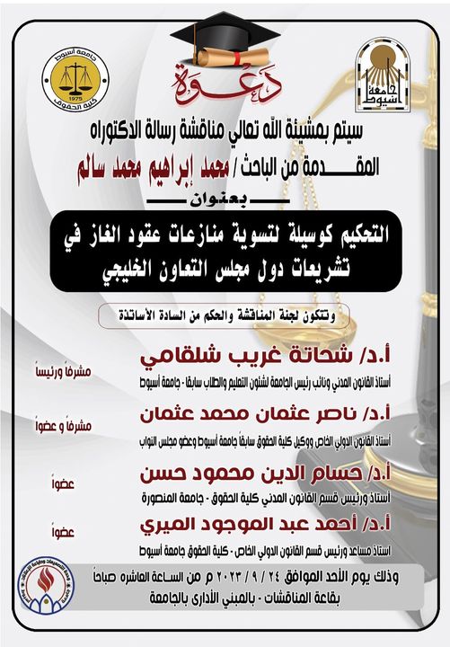 مناقشة رسالة الدكتوراة للباحث / محمد ابراهيم محمد سالم بعنوان " التحكيم كوسيلة لتسوية منازعات عقود الغاز في تشريعات دول مجلس التعاون الخليجي " 19 سبتمبر 2023