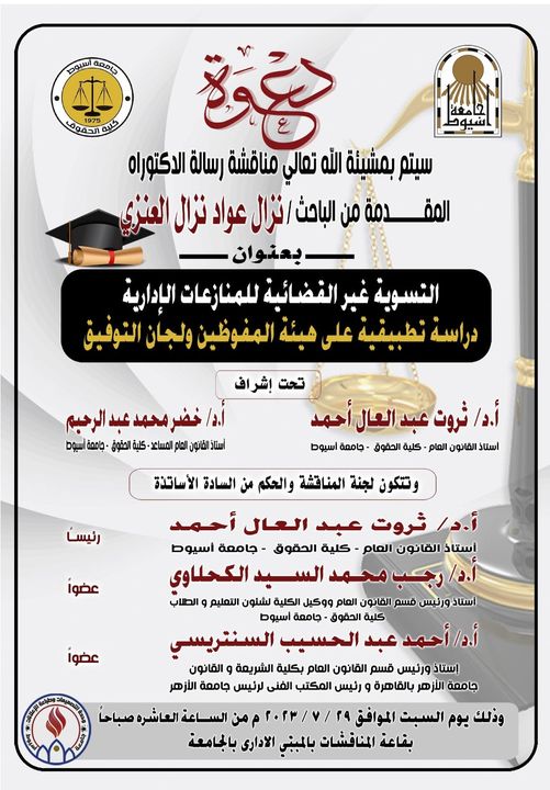 مناقشة رسالة الدكتوراة للباحث / نزال عواد نزال العنزي تحت عنوان " التسوية غير القضائية للنزاعات الإدارية - دراسة تطبيقية على هيئة المفوضين ولجان التوفيق "