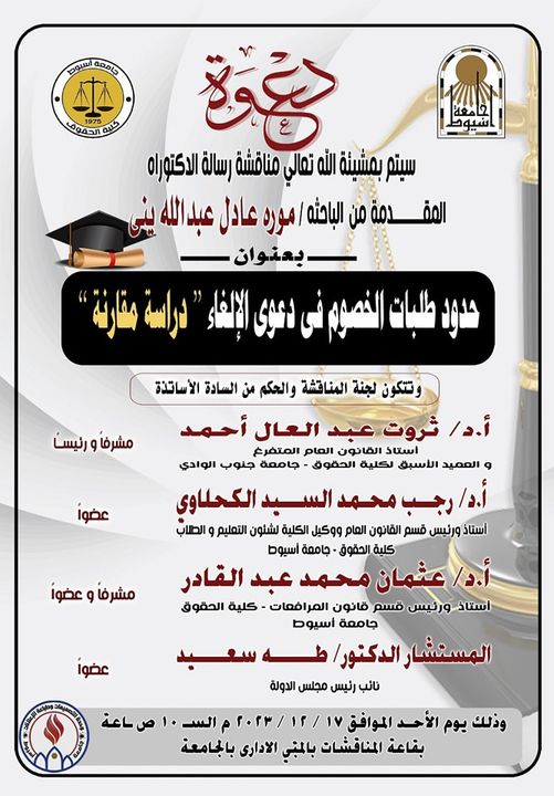 مناقشة رسالة الدكتوراة للباحثة / موره عادل عبدالله يني تحت عنوان " حدود طلبات الخصوم في دعوى الإلغاء - دراسة مقارنة " 13 ديسمبر 2023