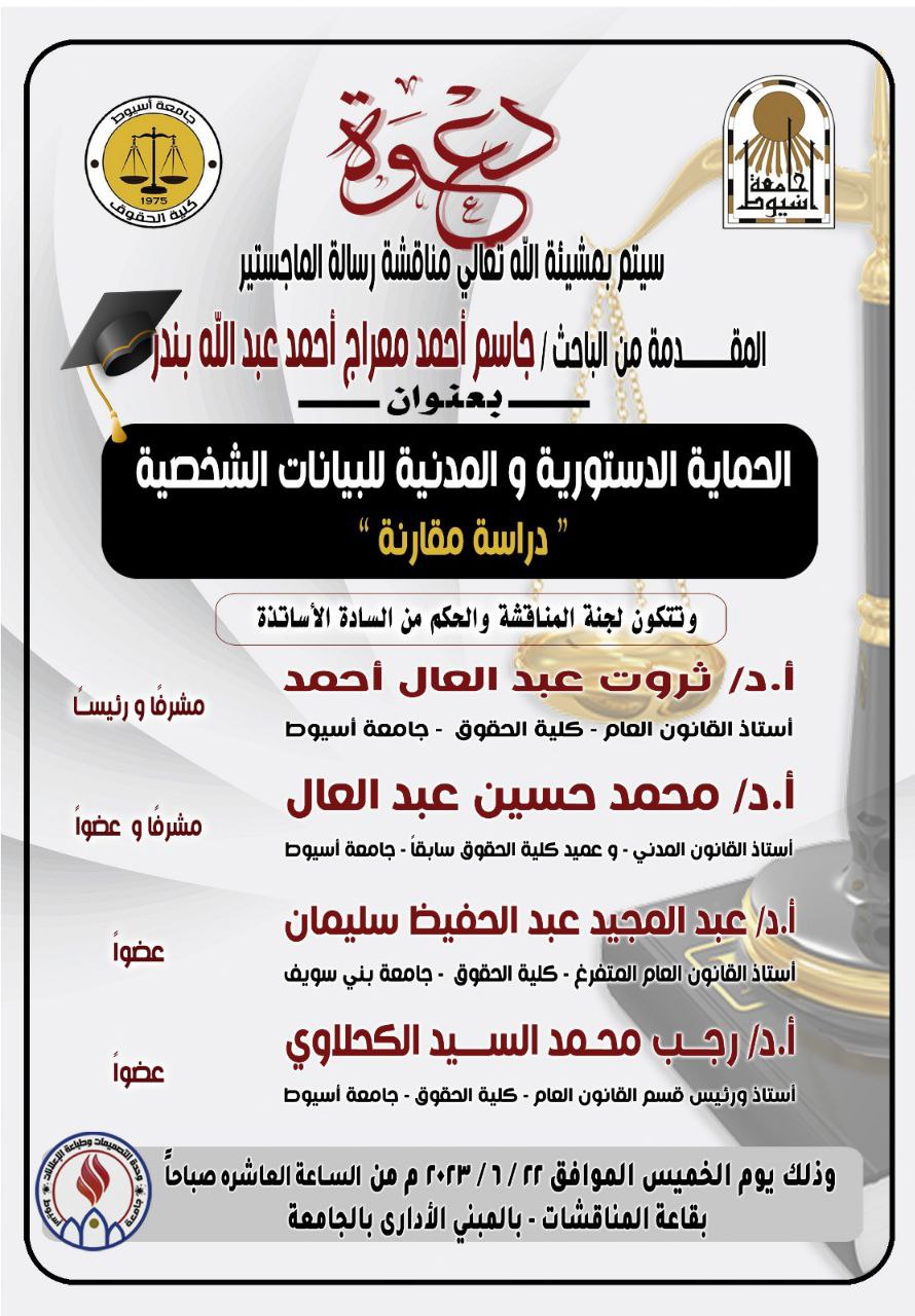 1- أ.د/ ثروت عبدالعال أحمد ، أستاذ القانون العام - كلية الحقوق ، جامعة أسيوط ، مشرف ورئيس لجنة الحكم