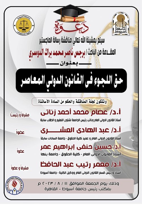 مناقشة رسالة الماجستير للطالب / برجس ناصر محمد براك الدوسري ـ تحت عنوان " حق اللجوء في القانون الدولي المعاصر " 10 أغسطس 2023
