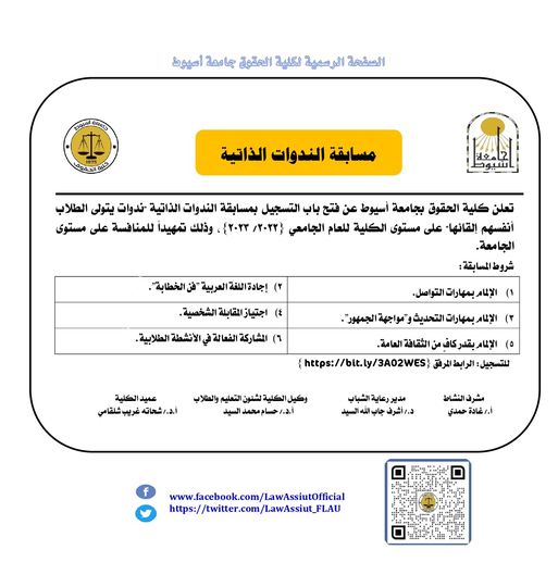مسابقة الندوات الذاتية 2022 9 نوفمبر 2022 رابط التسجيل: https://bit.ly/3A02WES ملحوظة: سيتم إجراء المقابلات يوم الإثنين الموافق ١٣ نوفمبر ٢٠٢٢م.