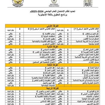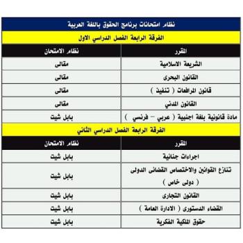 نظام الامتحانات لمقررات العام الجامعي 2025/2024 لبرنامج كليه الحقوق باللغه العربيه