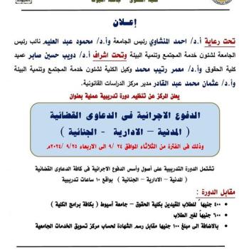 يعلن مركز الدراسات القانونية بكليه الحقوق عن الدورة التدريبيه الاتيه :