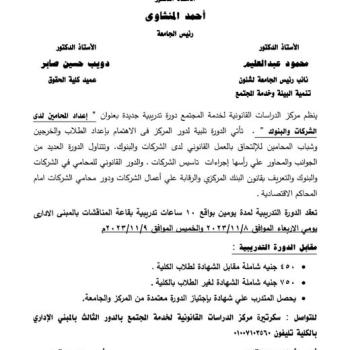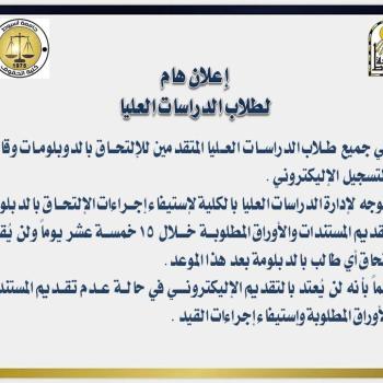 تنوه كلية الحقوق بأنه سيتم عقد دورة التربية العسكرية رقم: (22) فى المدة من 13 / 11 / 2023 إلى 26 / 11 / 2023، وعلى جميع الطلاب سرعة التقدم والتسجيل يدويا عن طريق إدارة التربية العسكرية بالجامعة،…