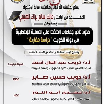 سيتم بمشيئة الله تعالى مناقشة رسالة الدكتوراة المقدمة من الباحث / مالك سالم براك سالم الهيفي( كويتي الجنسية )
