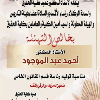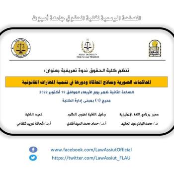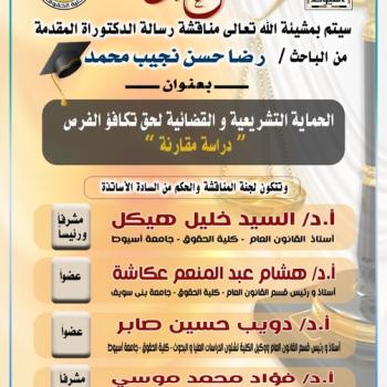 سيتم بمشيئة الله تعالى مناقشة رسالة الدكتوراة للباحث / رضا حسن نجيب محمد بعنوان " الحماية التشريعيةوالقضائية للحق في تكافؤ الفرص "