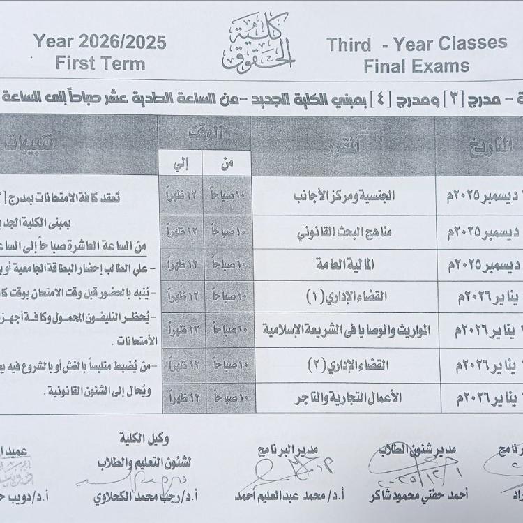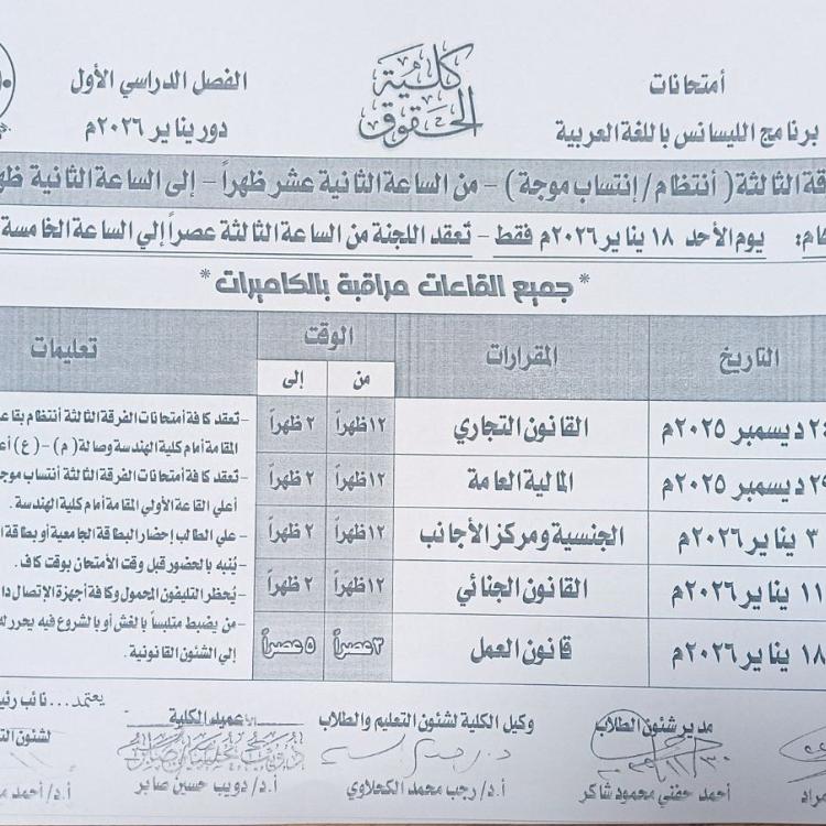 جدول امتحانات الفرقة الثالثة برنامج الليسانس باللغة العربية الفصل الدراسي الأول للعام الجامعي 2025 / 2026