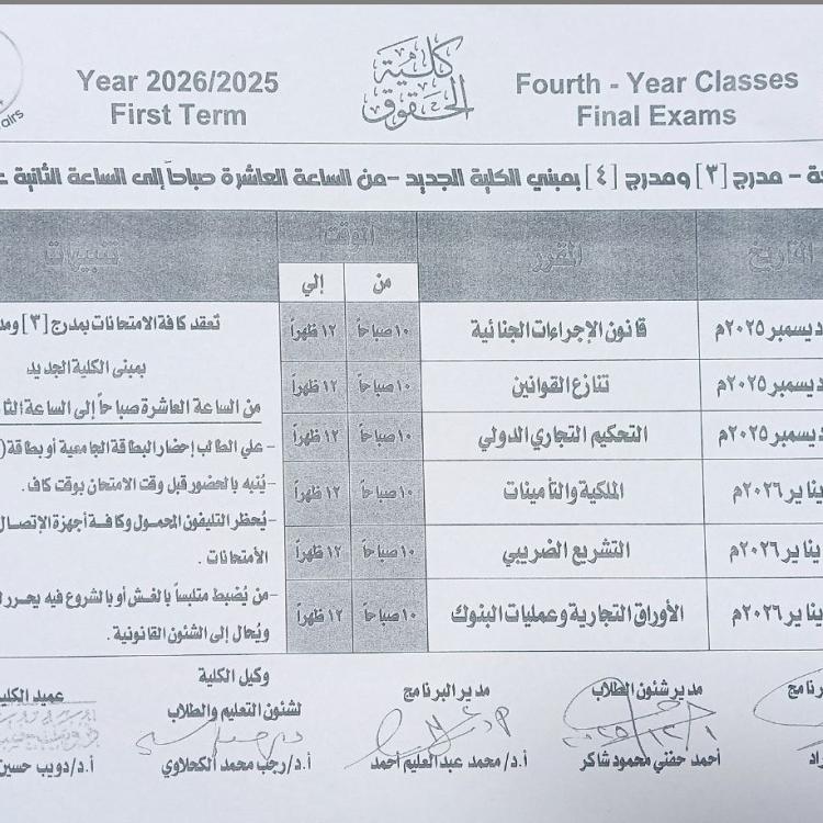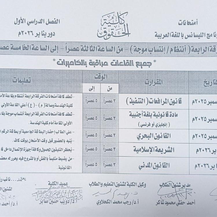 جدول امتحانات الفرقة الرابعة برنامج الليسانس باللغة العربية الفصل الدراسي الأول للعام الجامعي 2025 / 2026
