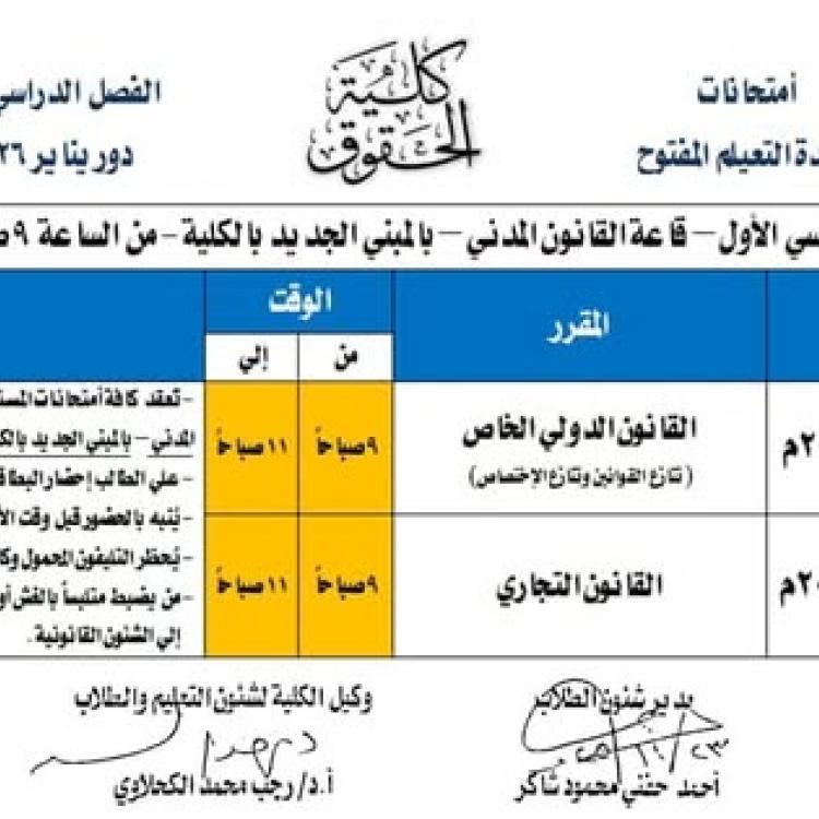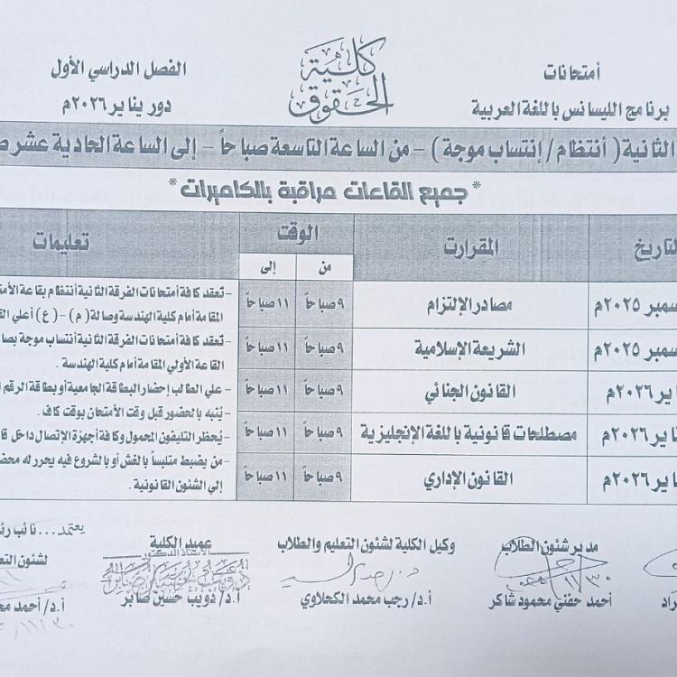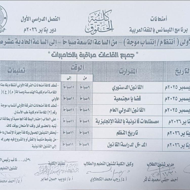 جدول امتحانات برنامج الليسانس باللغة العربية الفصل الدراسي الأول للعام الجامعي 2025 / 2026