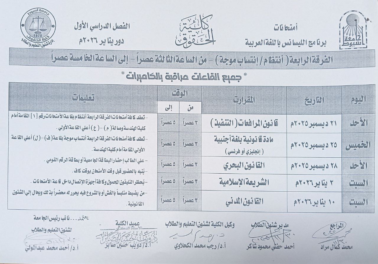 جدول امتحانات الفرقة الرابعة برنامج الليسانس باللغة العربية الفصل الدراسي الأول للعام الجامعي 2025 / 2026 2 ديسمبر 2025 جدول امتحانات الفرقة الرابعة برنامج الليسانس باللغة العربية الفصل الدراسي الأول للعام الجامعي 2025 / 2026