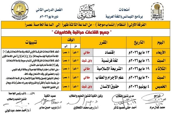 جدول امتحانات الفرقة الرابعة برنامج الليسانس باللغة العربية مايو٢٠٢٦م