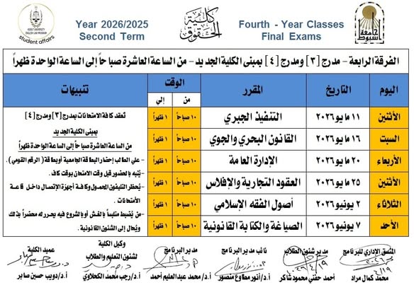 جداول امتحانات الفرقة الرابعة برنامج الحقوق باللغة الإنجليزية نهاية الفصل الدراسي الثاني مايو ٢٠٢٦م 19 أبريل 2026