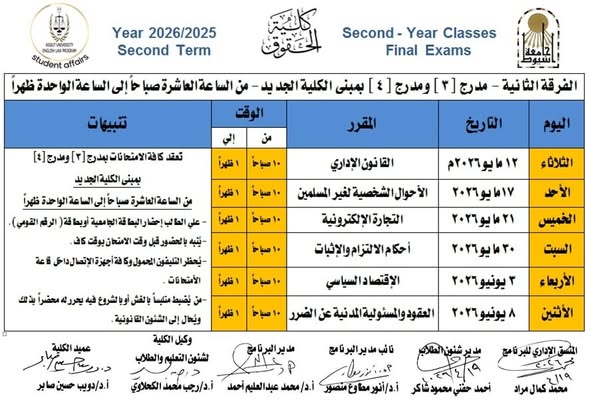 جداول امتحانات الفرقة الثانية برنامج الحقوق باللغة الإنجليزية نهاية الفصل الدراسي الثاني مايو ٢٠٢٦م 19 أبريل 2026