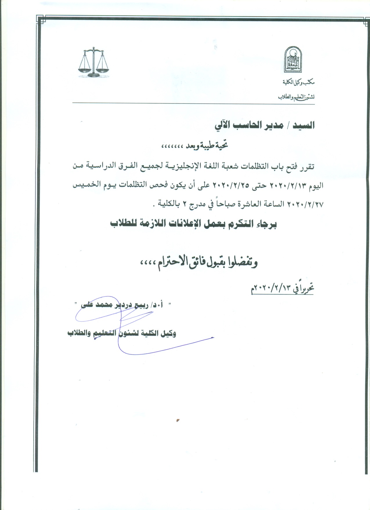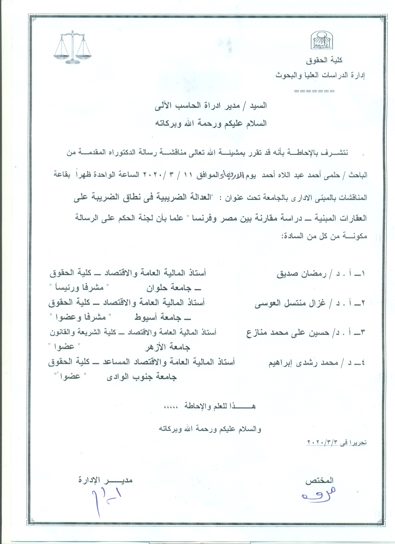 تقرر بمشيئة الله تعالي مناقشة رسالة الدكتوراة المقدمة من الباحث / حلمي احمد عبد اللاه احمد يوم الاربعاء الموافق 11/3/2020 في تمام الساعة الواحدة ظهرا بقاعة المناقشات بالمبني الاداري