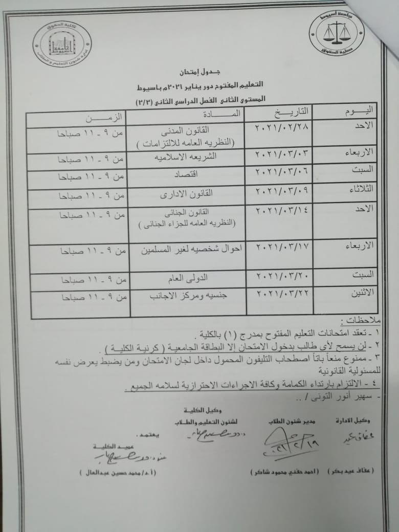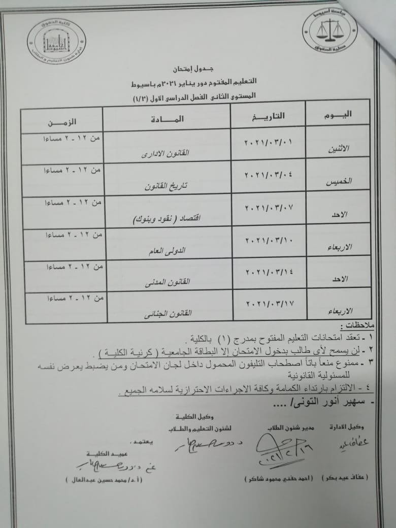 علما بانه لن يسمح نهائيا لاي طالب باداء الامتحانات بدون سداد الرسوم الجامعية