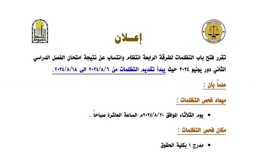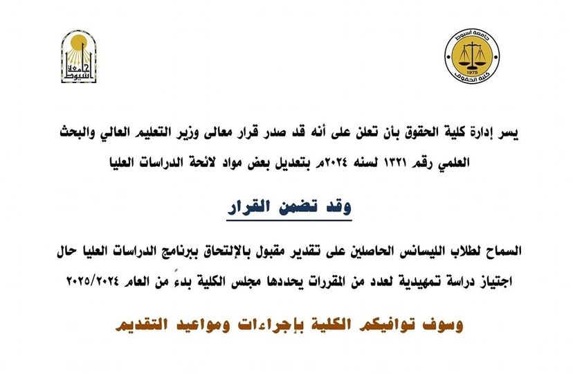 أعلن الدكتور أحمد المنشاوي رئيس الجامعة؛ تعديل اللائحة الداخلية لـ (مرحلة الدراسات العليا)؛ بنظام الساعات المعتمدة، لكلية الحقوق - جامعة أسيوط، والتي سيبدأ العمل بها مع انطلاق العام الدراسي الجديد ٢٠٢٤/ ٢٠٢٥م.