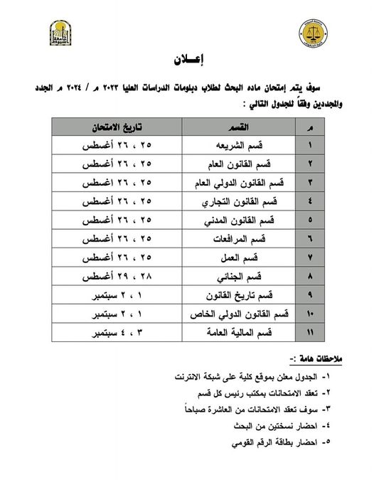 كشوف بأسماء الطلاب المتقدمين لامتحان ( البحث ) لدبلومات الدراسات العليا كليه الحقوق للعام الجامعي ٢٠٢٤/٢٠٢٣