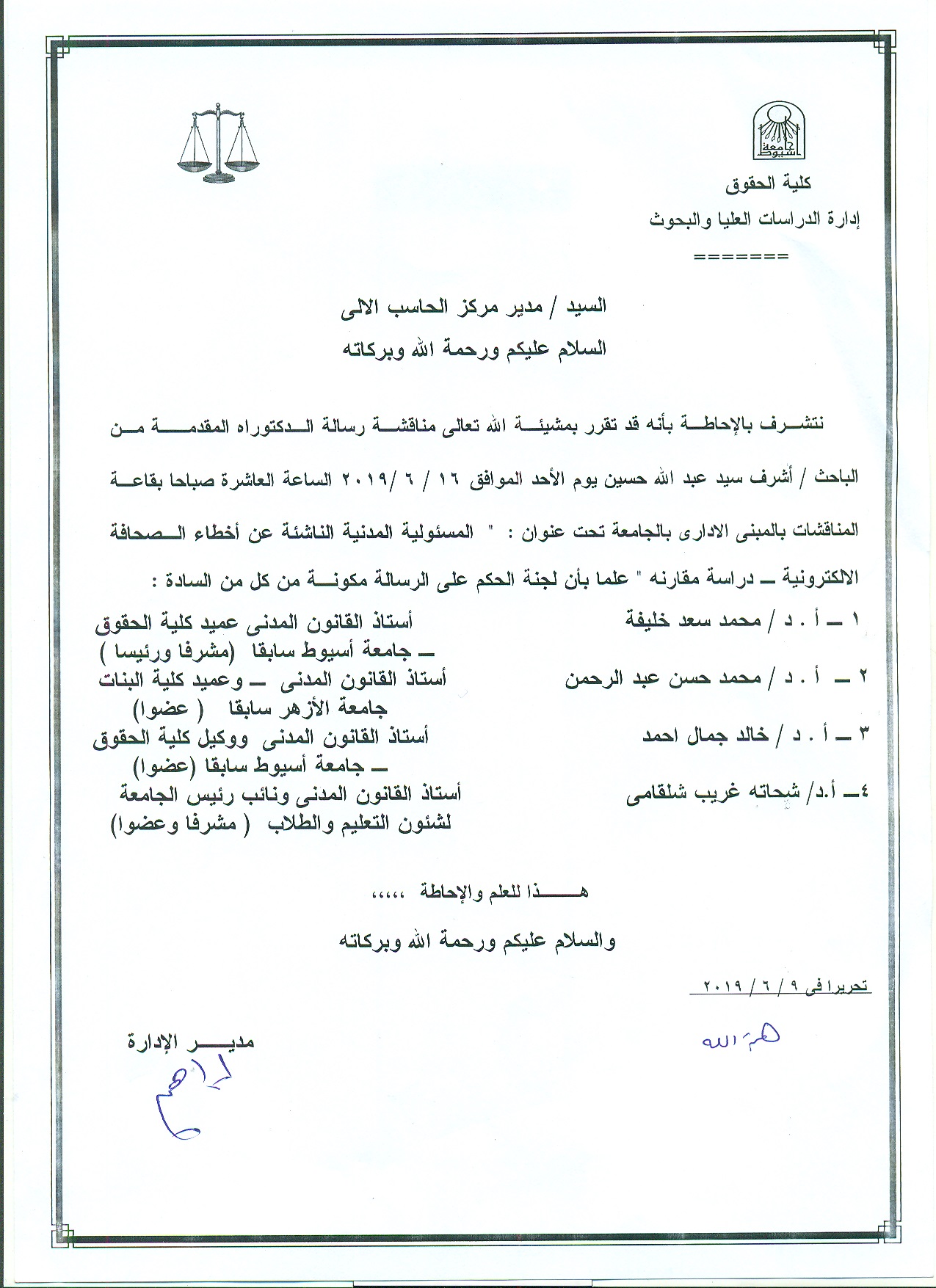 تقرر بمشيئة الله تعالي مناقشة رسالة الدكتوراه المقدمة من الباحث / اشرف سيد عبد الله حسين يوم الاحد الموافق 16 / 6 /2019 الساعة العاشرة صباحا بقاعة المناقشات بالمبني الاداري بالجامعه
