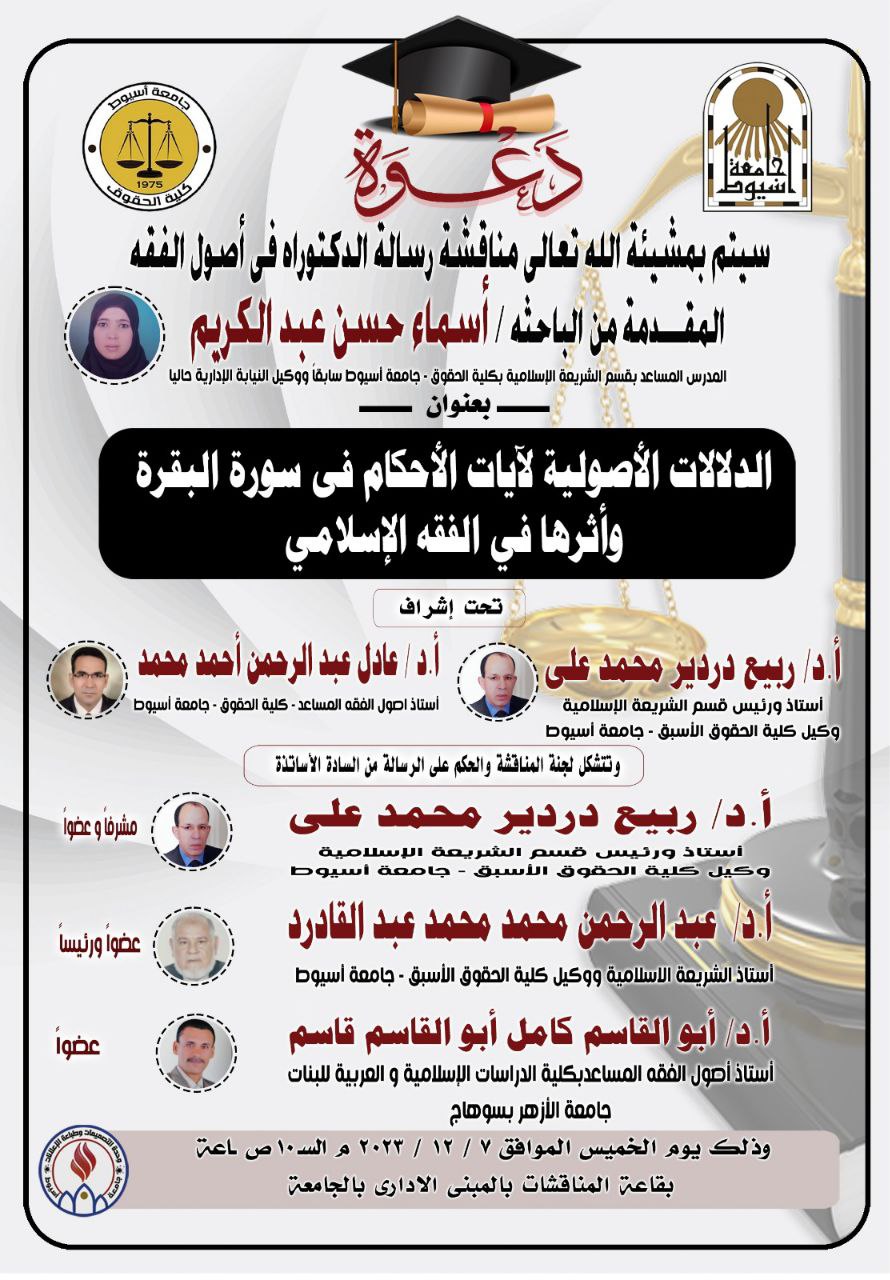 Discussion of the doctoral dissertation by researcher Asmaa Hassan Abdel Karim under the title “Fundamentalist connotations of the ruling verses in Surat Al-Baqarah and their impact on Islamic jurisprudence.”