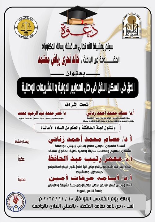 Discussion of the doctoral dissertation by researcher Khaled Fakhri Riad Motamed under the title “The Right to Adequate Housing in Light of International Standards and National Legislation”