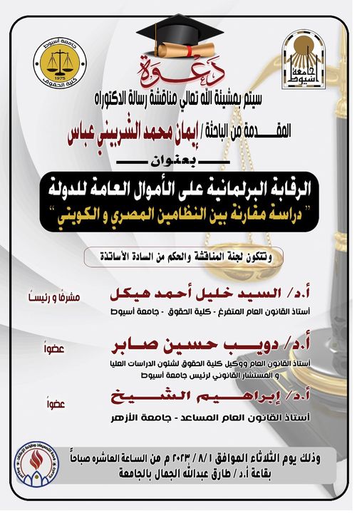Discussion of the doctoral thesis of the researcher / Iman Muhammad Al-Sherbiny Abbas under the title "Parliamentary control over the public funds of the state - a comparative study between the Egyptian and Kuwaiti systems"