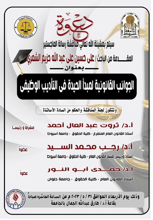 Discussion of the master's thesis submitted by the researcher / Ali Hussein Ali Abdullah Hazim Al-Shammari (Kuwaiti nationality) Under the title "Legal Aspects of the Principle of Impartiality in Professional Discipline - A Comparative Study between Egyptian and Kuwaiti Law" Note that the jury on the thesis is composed of each of the following gentlemen: 1- Prof. Dr. Tharwat Abdel Aal Ahmed, Emeritus Professor of Public Law - Faculty of Law - Assiut University (Supervisor and Chairman of the Judging Committee) 2- Prof. Dr. Hamdi Abu Al-Nour, Professor and Head of the Department of Public Law - Faculty of Law - Helwan University (Member of the Judging Committee) 3- Prof. Dr. Ragab Mohamed El-Sayed, Professor and Head of the Department of Public Law and Vice Dean for Education and Student Affairs - Assiut University (Member of the Judging Committee) On Thursday 31/5/2023 at 2:00 pm in the discussion hall in the administrative building of the university