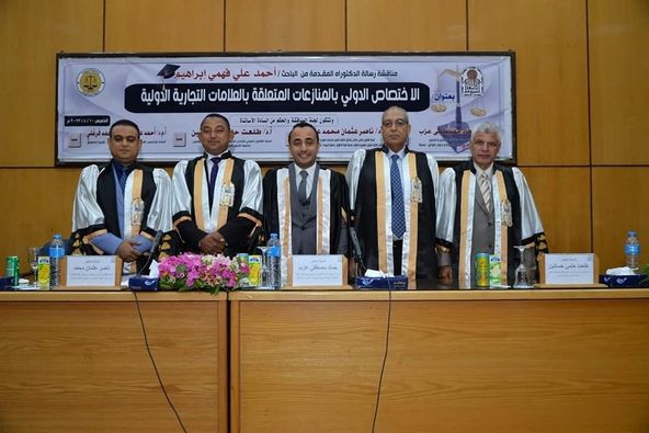 The Faculty of Law, Assiut University, discussed the researcher / Ahmed Ali Fahmy Ibrahim on the subject of "International Jurisdiction in Disputes Related to International Trademarks", and the researcher obtained an honor rating. The discussion committee consisted of: - Prof./ Hammad Mostafa Azab (Professor of Commercial and Maritime Law and Dean of the Faculty of Law at Assiut and South Valley Universities previously) - Prof. Dr. Nasser Othman Abu Zayed (Professor of Private International Law and Member of the House of Representatives, “Secretary of the Legislative Committee in the House of Representatives”) - Prof. Dr./ Talaat Helmy Hassanein (Assistant Professor of Private International Law at the Faculty of Sharia and Law in Assiut) - Prof. Dr. Ahmed Abdel Mawgoud Mohamed (Professor and Head of the Department of Private International Law, Faculty of Law, Assiut University) With the recommendation to exchange the message with Arab and foreign universities
