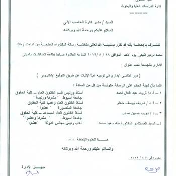 It was decided, God willing, to discuss the doctoral thesis submitted by the researcher / Ashraf Sayed Abdullah Hussein under the title "civil liability arising from the errors of electronic…