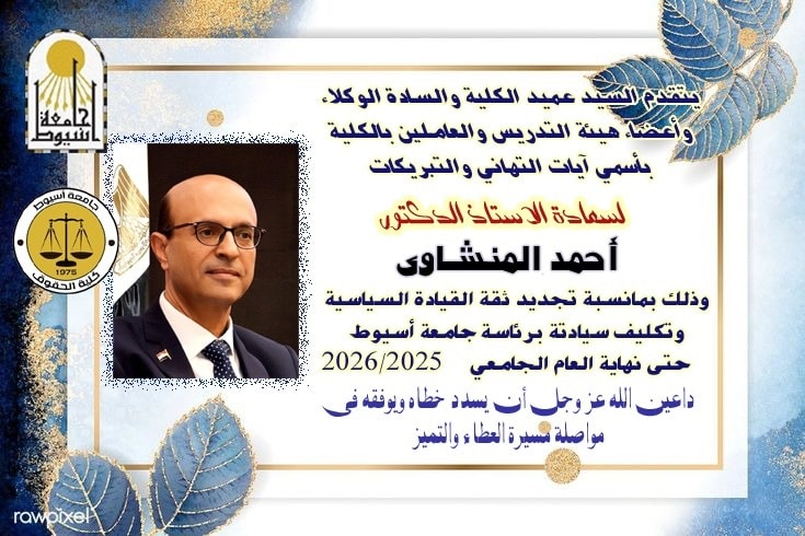 أسمى آيات التهاني والتبريكات لسعادة الأستاذ الدكتور / أحمد المنشاوي بمناسبة تجديد ثقة القيادة السياسية 4 أغسطس 2025