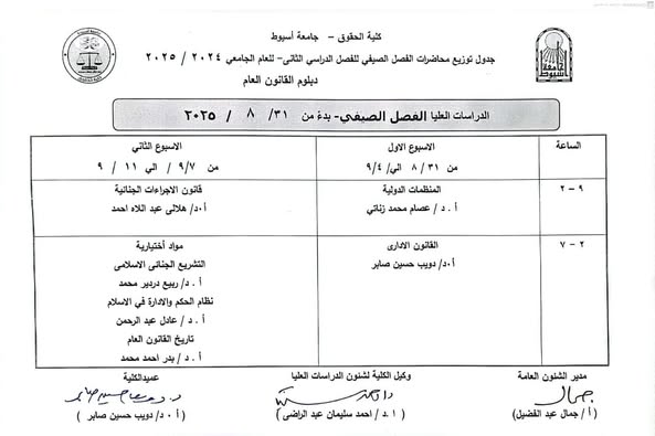 جداول توزيع محاضرات الدراسات العليا الفصل الدراسي الثاني للعام الجامعي 2024 / 2025 31 أغسطس 2025 لمزيد من التفاصيل الضغط على الرابط Faculty Of Law Assiut University كلية الحقوق جامعة أسيوط