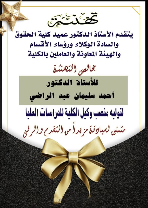 خالص التهنئة من السيد الأستاذ الدكتور / دويب حسين صابر