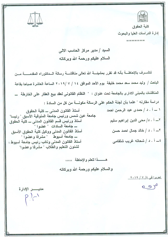سيتم بمشيئة الله تعالي مناقشة رسالة الدكتوراه المقدمة من الباحث / وليد محمد سعد محمد خليفة يوم الاحد الموافق 14/7/2019 الساعة العاشرة صباحا بقاعة المناقشات بالمبني الاداري بالجامعة