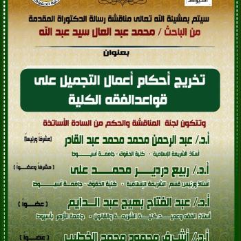 سيتم بمشيئة الله تعالي مناقشة رسالة الدكتوراه المقدمة من الباحث / محمد عبدالعال سيد عبدالله بعنوان تخريج أحكام أعمال التجميل على قواعد الفقه الكلية