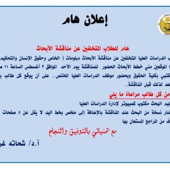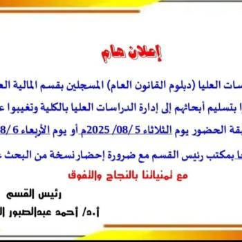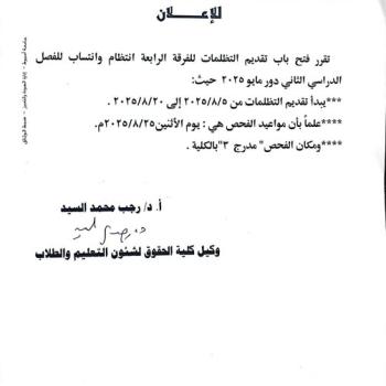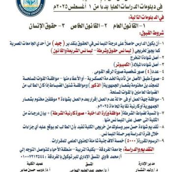 تعتزم كلية الحقوق بمناسبة اليوبيل الذهبي للكلية اقامة فعاليات اللقاء التعريفي الأول تحت عنوان مُستقبل خريجي برنامج الحقوق باللغة الإنجليزية، وذلك يوم الخميس الموافق ٣١ / ٧ / ٢٠٢٥ الساعة العاشرة…