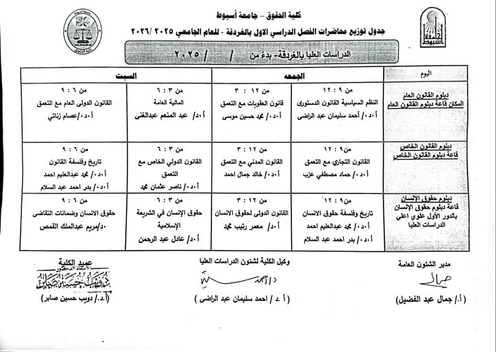 جدول توزيع محاضرات الدراسات العليا الفصل الدراسي الاول بالغردقة